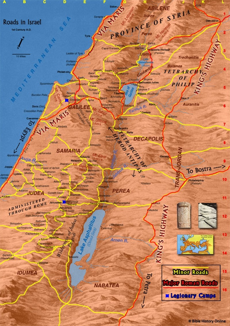 Travel in the Roman world was slow. A person walking at a decent pace over smooth terrain might cover 20-25 miles in a day, while an ox cart carrying a load of goods could only manage half that distance. The carriages used by wealthy travelers were not much faster, covering perhaps 30 miles in a day. They were designed to make the trip manageable, not for speed. Official mail couriers using government-provided horse relays were the speediest travelers, going as much as 40 to 60 miles in a day. (To estimate the amount of time it would take to get from one place to another in the Roman empire using different modes of travel, see the interactive map at https://orbis.stanford.edu/.)